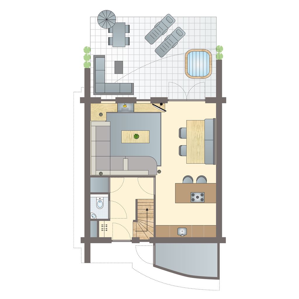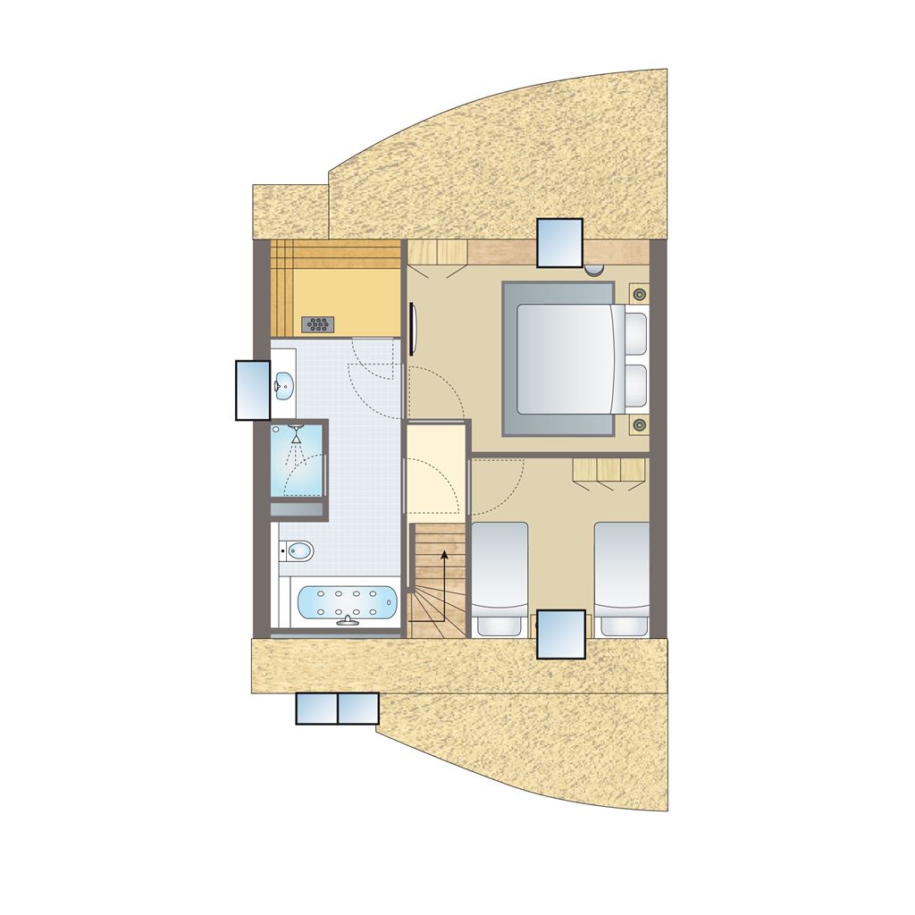 - Badezimmer mit Whirlpool, ebenerdiger Dusche mit Regendusche und WC auf der ersten Etage