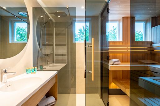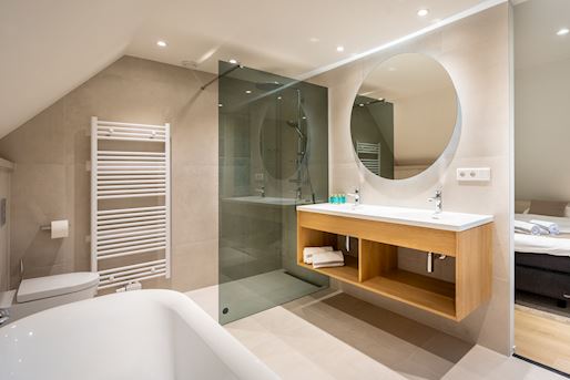 - Badezimmer (vom Schlafzimmer begehbar) mit Whirlpool, ebenerdiger Dusche, Regendusche, Waschbecken und WC auf der ersten Etage