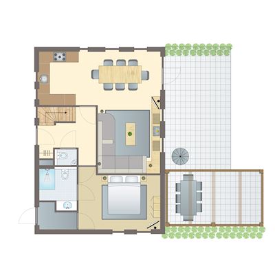 - Badezimmer (vom Schlafzimmer begehbar) mit ebenerdiger Dusche, Regendusche, Waschbecken und WC im Erdgeschoss